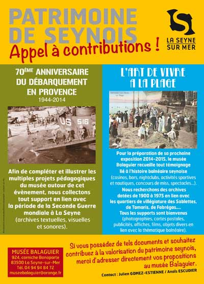 Veuillez trouver ci-dessus un appel à contributions du musée Balaguier concernant d'une part le 70e anniversaire du Débarquement de Provence et d'autre part l'histoire balnéaire seynoise ...