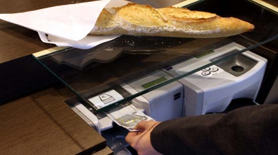 Un millier de boulangeries en France l'ont déjà adopté. Vous l'avez peut-être déjà remarquée en allant acheter votre baguette de pain... C'est une machine imposante grise et noire qui s'est glissée entre la boulangère et vous. Il s'agit d'une nouvelle génération de caisse enregistreuse. Un monnayeur, comme au péage de l'autoroute, qui trie les pièces et les billets, les avale et rend la monnaie.