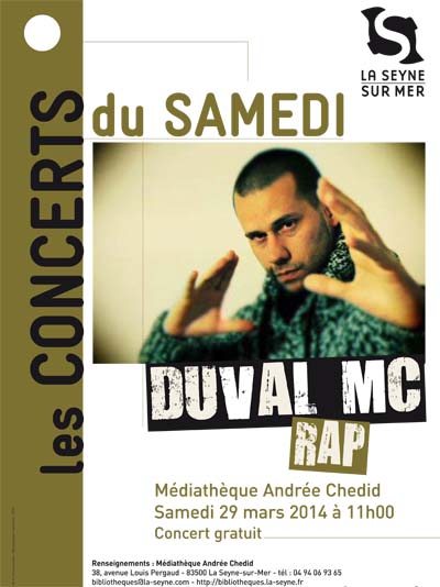 SAMEDI 22 MARS de 15 à 17h : atelier Rap, animé par Duval MC, rappeur, chroniqueur et animateur social. Création de textes qui seront joués en public lors du concert de Duval Mc à la médiathèque Andrée Chedid le 29 mars.