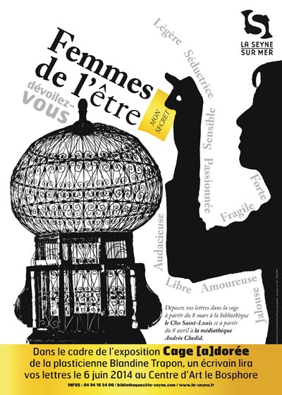La plasticienne Blandine Trapon vous propose de déposer des lettres intimes dans une jolie cage à oiseaux, placée dès le samedi 8 mars dans la bibliothèque Le Clos Saint-Louis. Vous pourrez, de façon anonyme, écrire vos secrets les plus chers. A partir du 8 avril suivant, la cage sera à la médiathèque Andrée Chedid, pendant un mois également.