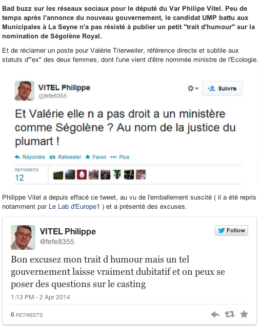Alors, pourquoi avoir relevé le tweet de Mr. Vittel et le rediffuser ici?? si pour vous tous les partis se valent?? Faîtes-moi un medley de toutes les petites phrases "assassines" de tous le monde, là je comprendrais votre position, mais ne reprendre qu'un seul tweet, et de plus venant de droite, permettez-moi le doute!!
