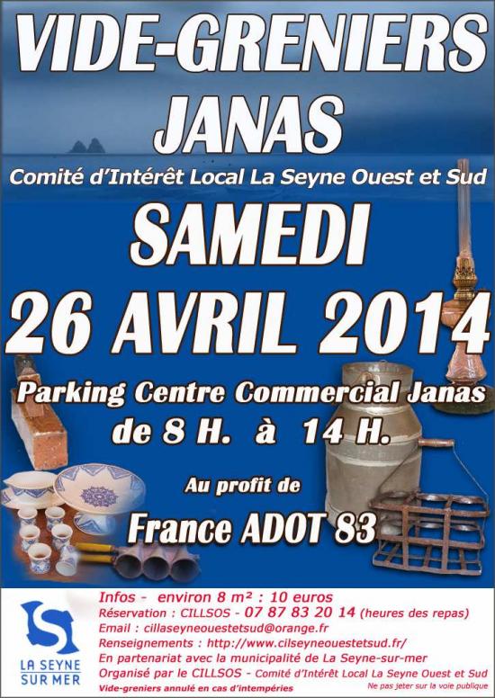 Le CILLSOS organise le 26 avril 2014, parking du Centre commercial de Janas, un vide-greniers dont les recettes des emplacements ( tous réservés à ce jour) seront reversées à l'Association FRANCE ADOT 83.
