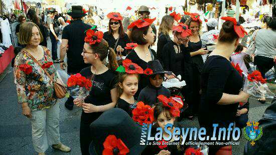 Chapeautés et maquillés nous allons vers les gens pour leur distribuer de jolis coquelicots que nous avons fabriqués, ainsi que des biscuits offerts par des commerçants de la ville, pour distribuer de la bonne humeur !