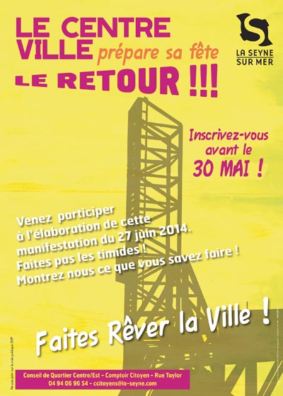 Veuillez trouver ci-joint une affiche concernant les inscriptions, avant la fin du mois au Comptoir citoyen, rue Taylor, pour les participants de la fête du centre ville, organisée par le conseil de quartier centre-est, vendredi 27 juin 2014 ...