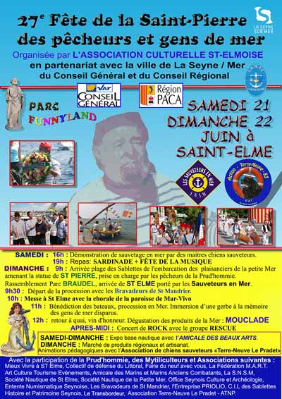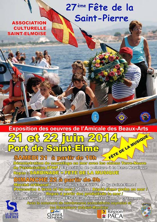 A l'occasion de la 27ème fête de la mer et des gens de mer, la Ville et l’Association culturelle Saint-Elmoise vous convient à un vin d'honneur dimanche 22 juin 2014 à midi ... Rendez-vous est fixé sur le port de Saint-Elme