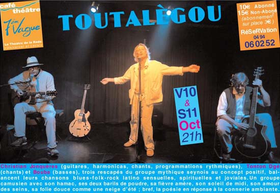 Christian Jonquères (guitares, harmonicas, chants, programmations rythmiques), Bouba (basses) et Tonton Dgé (chant), reviennent avec leurs superbes chansons blues latino et leur univers poétique, cinématographique et libérant. Du sens et de la bonne humeur... Toutalègou: vendredi 10 octobre 2014 - samedi 11 octobre 2014 - 21h00 à la 7ème Vague