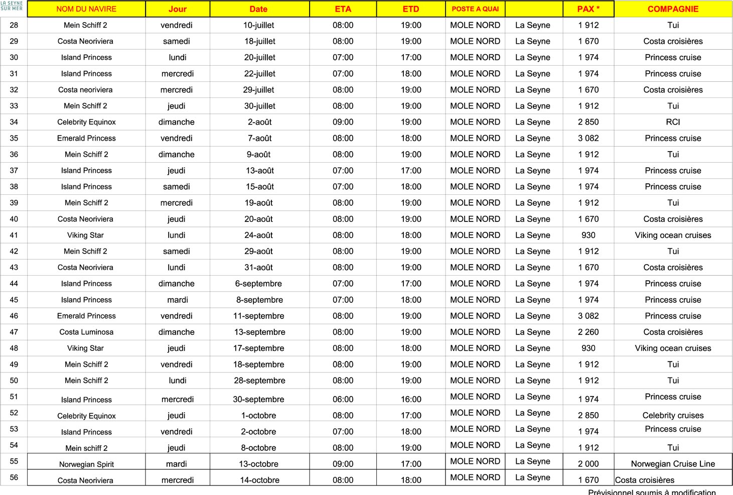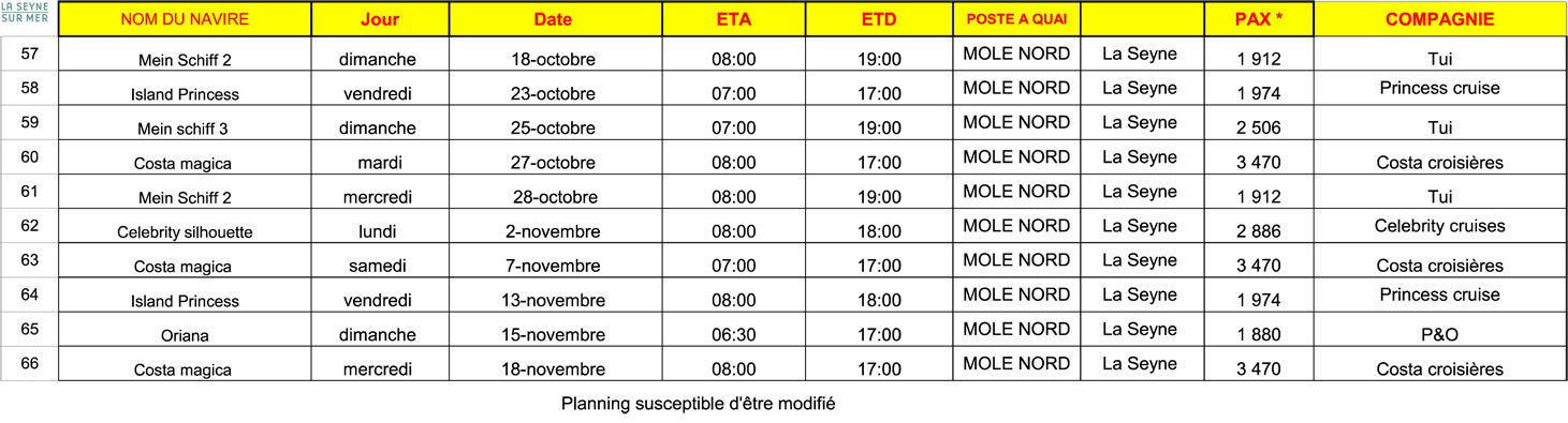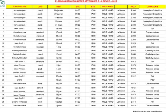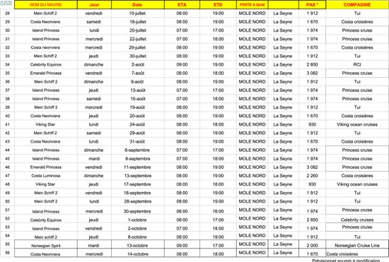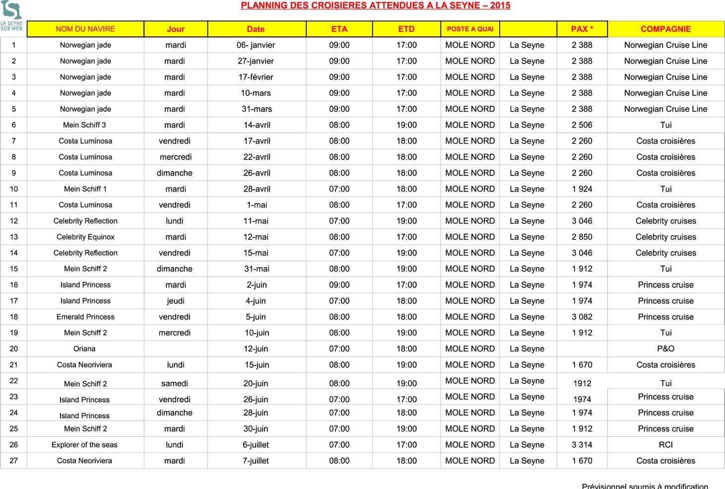 Le Planning des Croisières attendues à La Seyne sur Mer en 2015