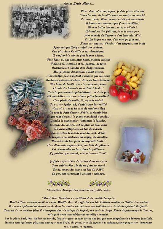 J'avais 10-12 ans, j'habitais au quartier Barban et une de mes voisines -Mme Oddone- descendait tout les matins avec son charreton pour vendre les légumes de son jardin, quelques salades, poireaux, blettes, tomates et autres selon la saison, légumes qu'elle pesait avec sa balance romaine.. J'allais quelques fois, avec elle et dans un coin de son stand je proposai également ma "production", de la salade sauvage, cousteline et même des escargots pour faire la suçarelle et je l'aidai surtout à pousser le charreton du retour car il fallait remonter. Son mari venait aussi à notre rencontre car la pente était raide.