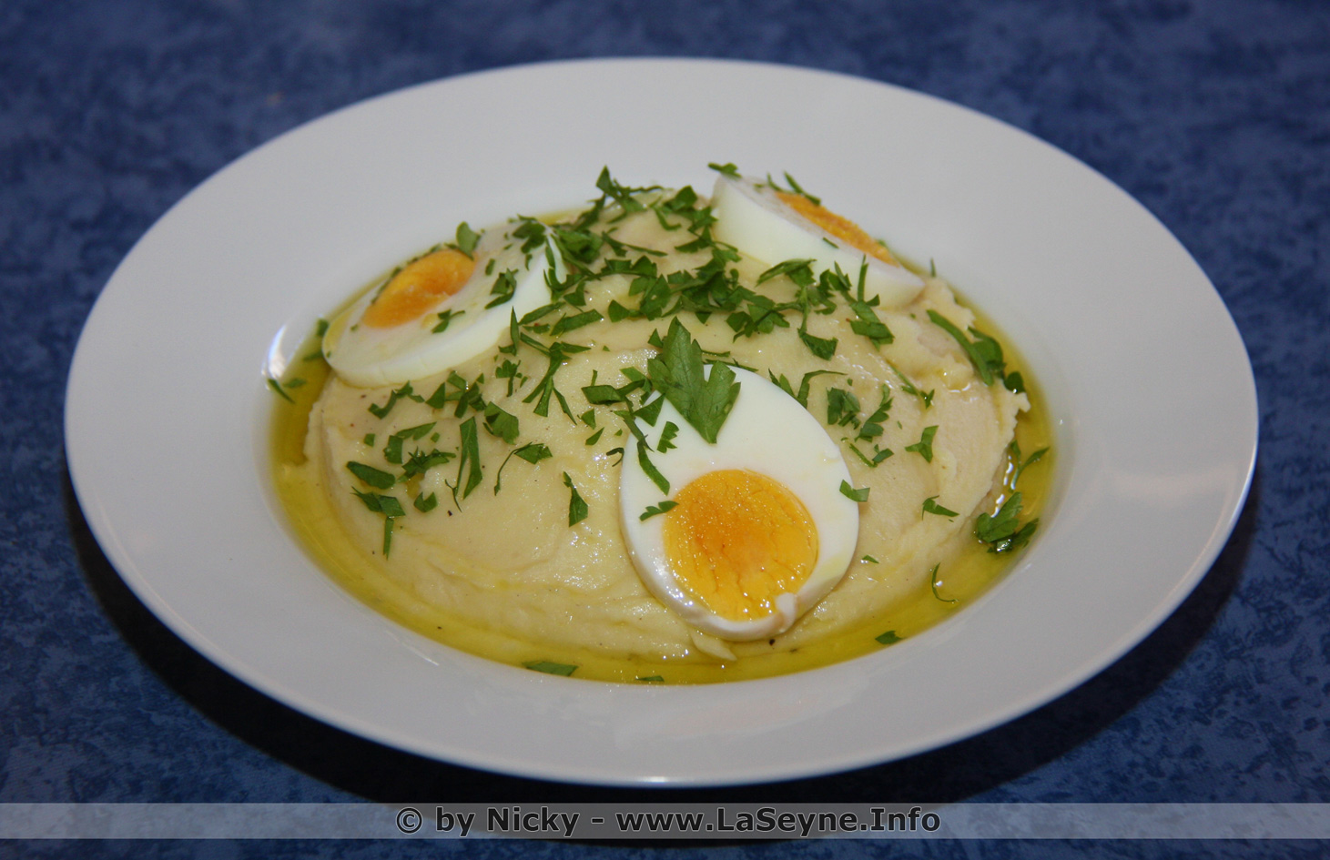 Purée de Patates,Œufs durs, Persil frais et un filet d'Huile d'Olives