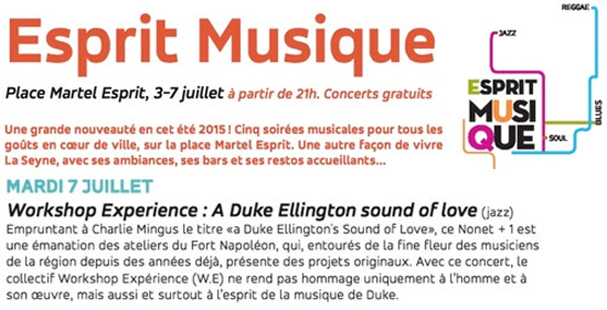 Le Workshop Experience se produira en grande formation, place Martel Esprit, le 7 juillet 2015 à 21 h. Vous pourrez écouter nos arrangements autour de la musique de Duke Ellington en plein centre ville de la Seyne !