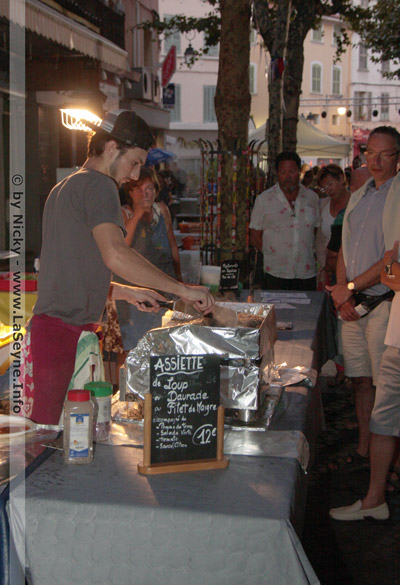 En plein coeur de ville, sous les platanes du cours Louis Blanc, où se tient, chaque matin, le marché provençal, passez une agréable soirée musicale et gastronomique ... Producteurs locaux et commerçants vous attendent pour vous régaler d'authentiques produits de l'aquaculture et de la pêche locale. Au menu : loups et dorades grillés à la plancha, coquillages ou bien encore plats cuisinés à base de poisson ...