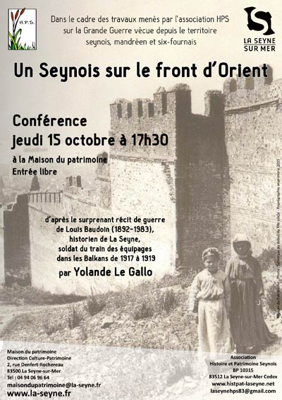 Yolande Le Gallo de l'association Histoire et Patrimoine Seynois animera une conférence - "Un Seynois sur le front d'Orient" le jeudi 15 octobre 2015 à 17h30 à la Maison du Patrimoine