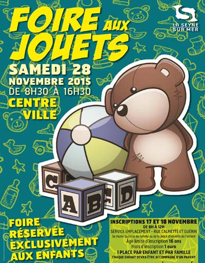 La Foire aux jouets se tiendra le samedi 28 novembre 2015 au centre-ville de 08h30 à 16h30. Cette manifestation permettra aux enfants de vendre jeux et jouets qu’ils n’utilisent plus