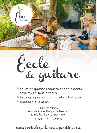 je vous informe de la création d'une nouvelle école de guitare située à La Seyne qui accueille ses élèves depuis septembre 2015 dans un lieu et un cadre tout à fait original qui est celui d'un jardin.