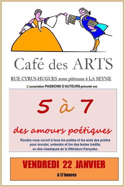 L’association PASSIONS D’AUTEURS présente ses 5 à 7 des Amours poétiques, le VENDREDI 22 JANVIER 2016 à 17 heures au Café des ARTS - RUE CYRUS-HUGUES zone piétonne à LA SEYNE