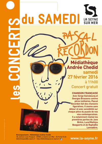 Les Seynois sont conviés à un concert de Pascal Recordon (chanson française), samedi 27 février 2016 à 11 heures, à l'espace musique de la médiathèque Andrée Chedid, 38, avenue Louis Pergaud