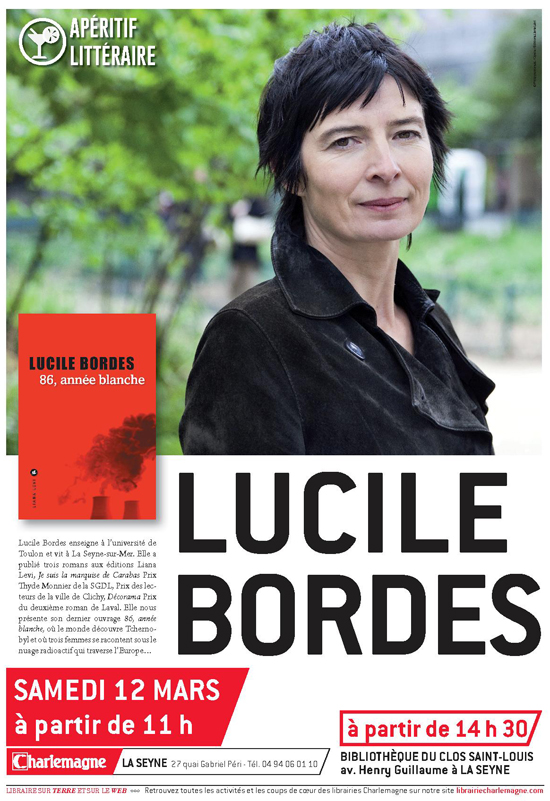 « Lucile Bordes enseigne à l’université de Toulon et vit à La Seyne-sur-Mer. Elle a publié trois romans aux éditions Liana Levi "Je suis la marquise de Carabas", Prix Thyde Monnier de la SGDL, Prix des lecteurs de la ville de Clichy, "Décorama", Prix du deuxième roman de Laval. Elle nous présente son dernier ouvrage 86, année blanche, où le monde découvre Tchernobyl et où trois femmes se racontent sous le nuage radioactif qui traverse l’Europe... »