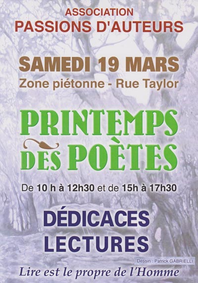 Pour la journée nationale du Printemps des Poètes, l'association Passions d'Auteurs a le plaisir de vous retrouver, le matin, pour des présentations, dédicaces et lectures, puis, l'après-midi, des lectures, spectacles poétiques et performances littéraires ... rue Taylor au centre-ville de La Seyne