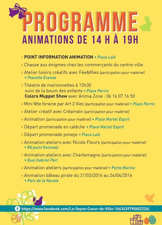 ANIMATIONS DE PÂQUES - Samedi 26 mars 2016 - de 14:00 à 19:00 au Centre ville de La Seyne sur Mer ... Les commerçants du centre-ville de La Seyne s'activent pour proposer de nombreuses animations pour les enfants !