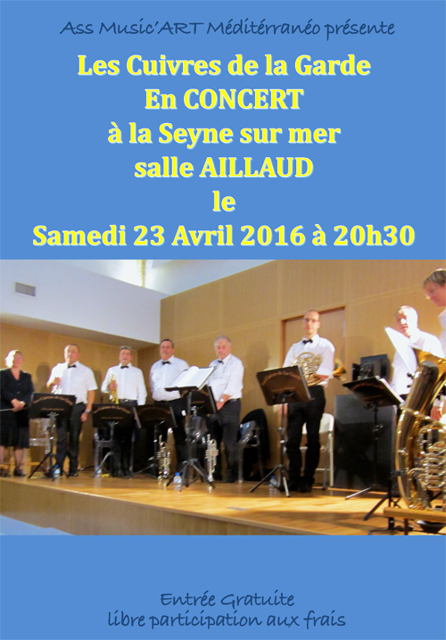 Nous avons le plaisir de vous informer qu'un concert, organisé par l'association "Music' ART Méditérranéo" et interprété par "l'Ensemble des Cuivres de La Garde" se déroulera dans notre salle: Le samedi 23 avril 2016 à 20h30