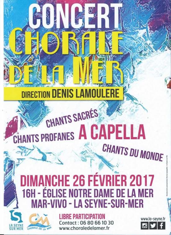 La Chorale de la Mer sous la direction de son nouveau chef Denis LAMOULERE, est heureuse de vous inviter à un concert en l’église de Notre Dame de la Mer (MAR VIVO) à La Seyne sur Mer,