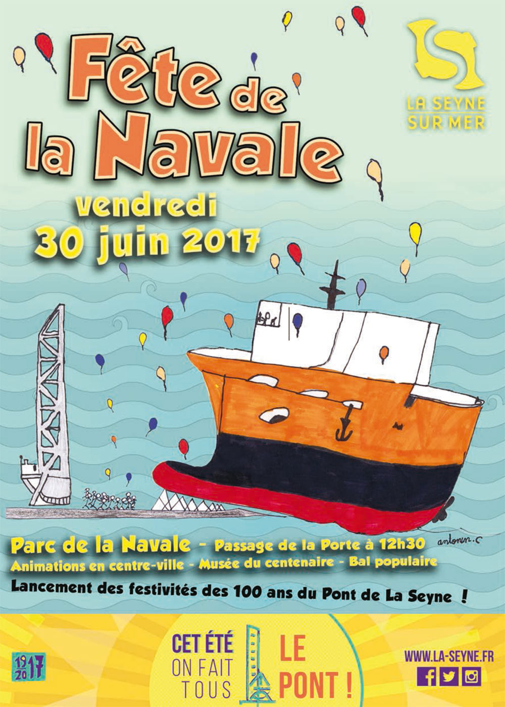 Festivités du centenaire à partir du vendredi 30 juin 2017 au Parc de la Navale ... Ne manquez pas la grande soirée d'ouverture des festivités pour les 100 ans du pont avec "La fête de la Navale", parc de la Navale, le vendredi 30 juin à 18 heures sans oublier le passage rituel de la Porte des chantiers à 12H30 - voir le Programme - cliquez ici