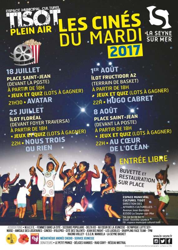 Comme l’été dernier, venez vous faire une toile en plein air avec les cinés du mardi qui redémarrent le 18 juillet avec le film Avatar. Rendez-vous à partir de 18h, place saint jean, pour des jeux et des quiz en attendant le film ... Dans le cadre de l’opération « Bouge ton été », le service culturel municipal Tisot fait cette année encore son cinéma ….