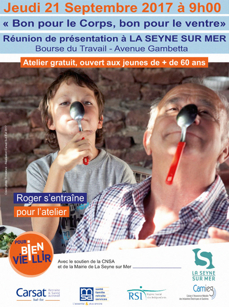 Bien Vieillir: Atelier Nutrition, le Jeudi 21 Septembre 2017 à partir de 9 heures à la Bourse du travail – avenue Gambetta ... Dans le cadre des ateliers du bien vieillir, jeudi 21 septembre 2017 à 9 heures, la Bourse du Travail accueille un atelier intitulé "Bon pour le corps, bon pour le ventre"... Cette conférence est organisée par la MSA en partenariat avec la ville et s'adresse aux seniors de plus de 60 ans.