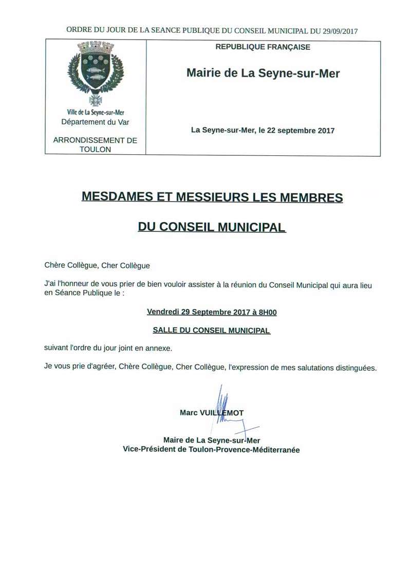 Conseil municipal: Vendredi 29 Septembre 2017 à 8 Heures - Salle du conseil – Hôtel de ville ... Vous êtes conviés au prochain conseil municipal, vendredi 29 septembre à 8 heures ... Rendez-vous est fixé salle du conseil, au premier étage de l'hôtel de ville ... Ci-joint l'ordre du jour.