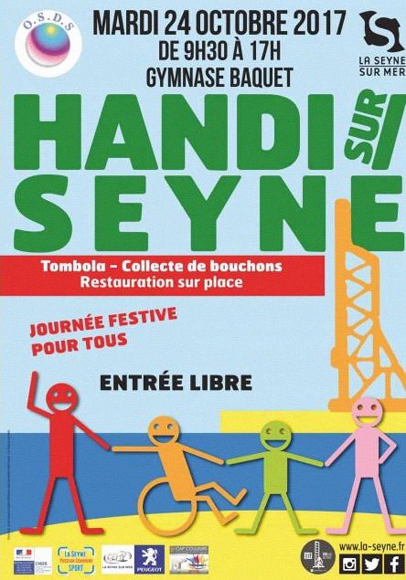 Handi sur Seyne: Mardi 24 Octobre 2017 ... L'Office Seynois Des Sports et la ville de la Seyne-sur-mer organisent la 4ème édition d'"Handi sur Seyne" ! Cette journée festive a pour objectif de faire connaître les associations seynoises utiles pour le public porteur d'un handicap, mais aussi de changer le regard sur le handicap par la mixité des rencontres, par le partage et l'échange. Tous ensemble handi-valides changeons le regard sur le handicap. Journée festive pour tous. Tombola, collecte de bouchons, restauration sur place.
