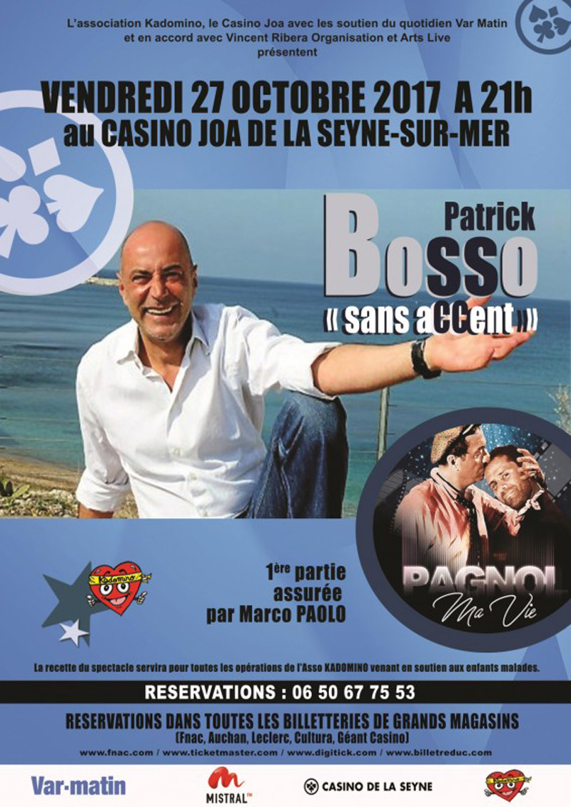 Patrick Bosso dans "Sans Accent" et en 1ère Partie Marco Paolo le 27 Octobre 2017 au Casino Joa La Seyne sur Mer ... "Oh Bosso! Comment on fait pour faire "connu" comme travail ?!" C'est un jeune de mon ancienne cité de Marseille qui m'a posé la question ..." - "J'ai écrit ce spectacle pour lui répondre à travers mon parcours le plus sincèrement possible."