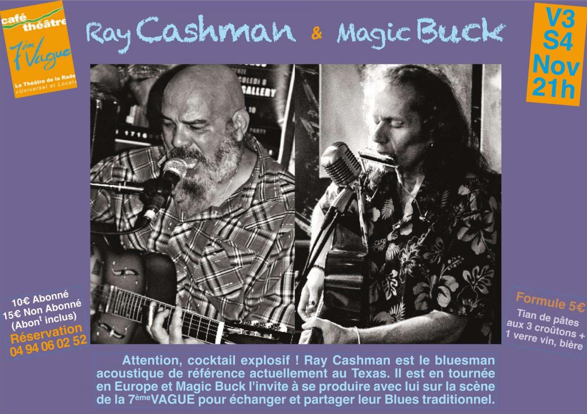 Attention, cocktail explosif ! Ray Cashman est le bluesman acoustique de référence actuellement au Texas. Il est en tournée en Europe et Magic Buck l'invite à se produire avec lui sur la scène de la 7 VAGUE pour échanger et partager leur Blues traditionnel. V3 & S4 Novembre 2017 à 21h00