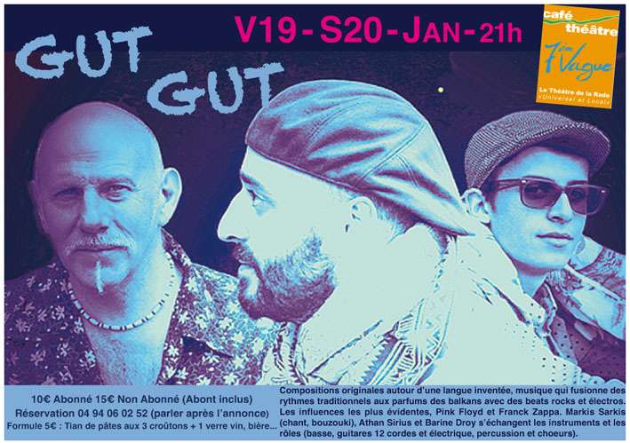 Ce vendredi 19 et samedi 20 Janvier 2018 à 21h00Le super Trio GUT GUT ça pulse et ça voyageréserver par simple appel Tél : 04 94 06 02 52 (parler après l'annonce)