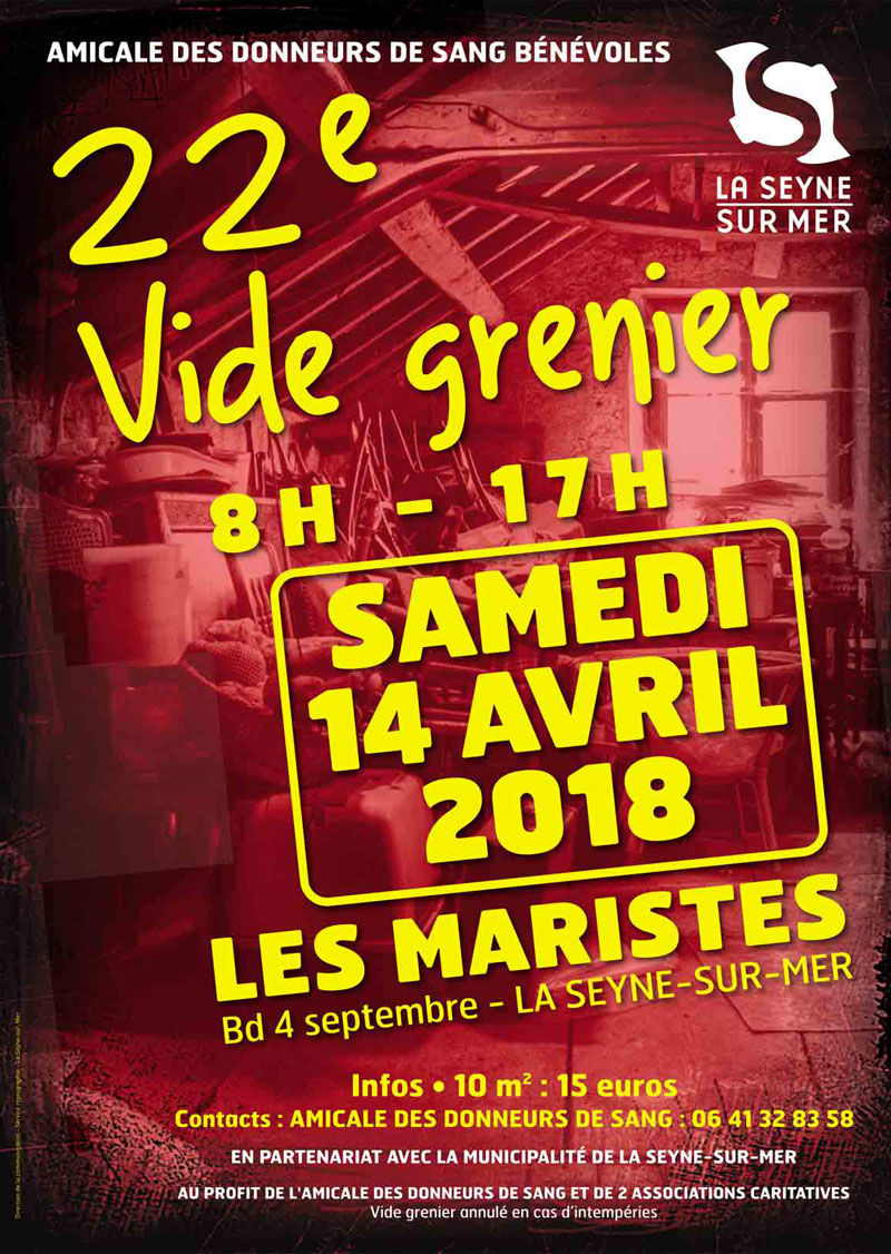 Vide-Grenier de l'Amicale des Donneurs de Sang, le 14 Avril 2018 aux Maristes à La Seyne sur Mer - Samedi 14 avril 2018 à partir de 8 heures et jusqu'à 17h00, un vingt-deuxième vide-grenier sera organisé aux Maristes (Institution Sainte Marie - Bd du 4 Septembre), au profit de l'amicale des donneurs de sang bénévoles en partenariat avec la Ville. Inscription 15 € l'emplacement pour 10 m². Plus d'informations au 06 41 32 83 58.