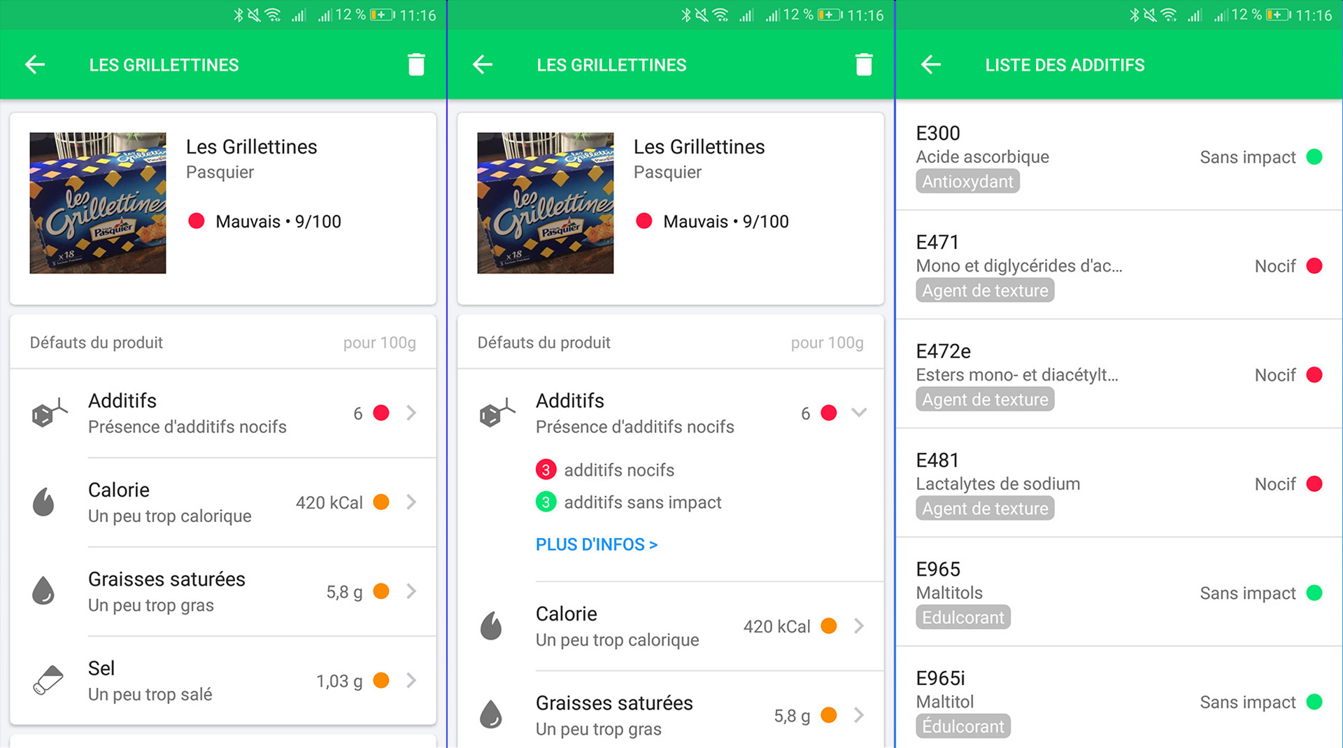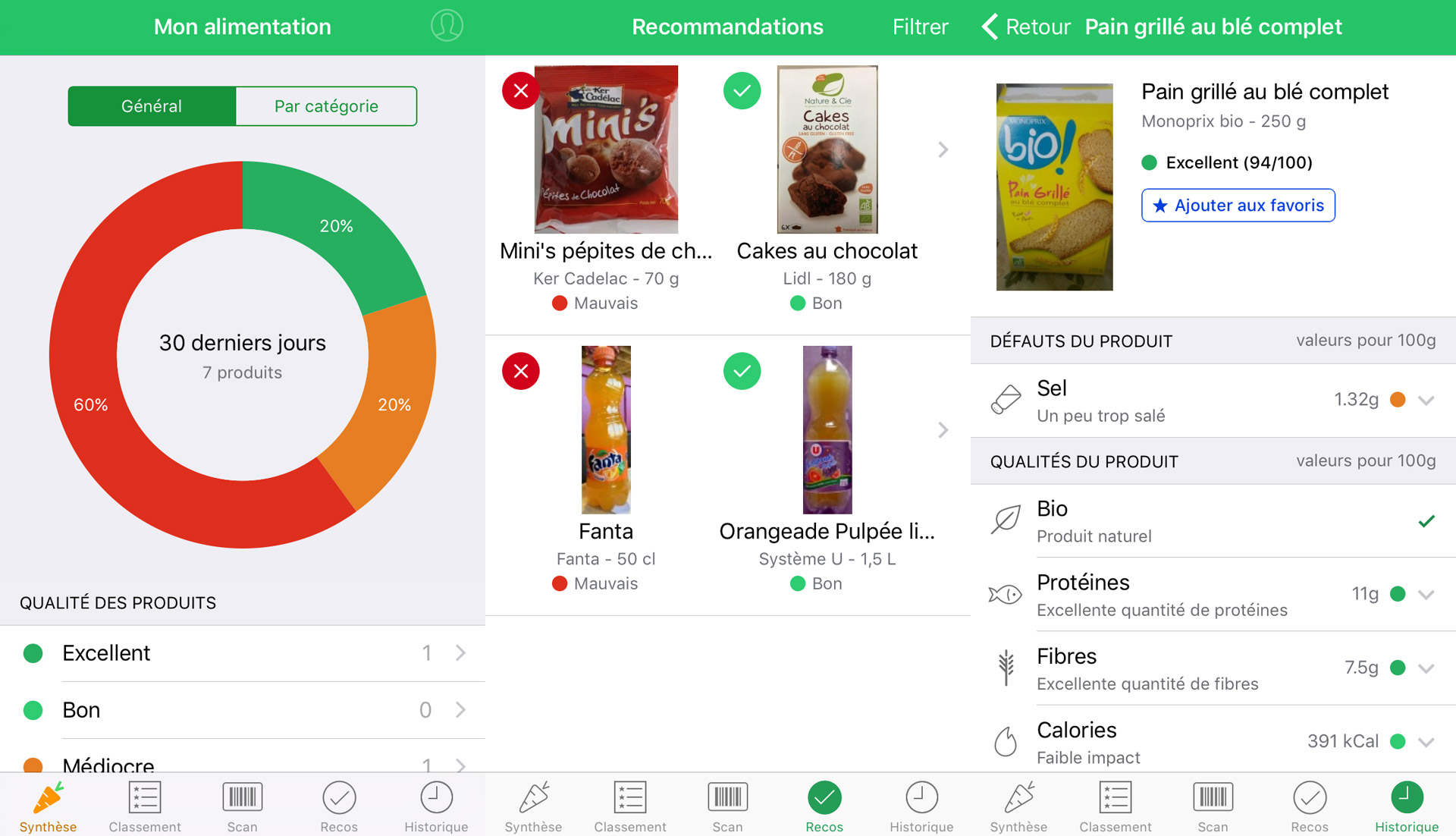 Comment ça marche ?.. Le principe est le suivant : au moment de choisir un produit au supermarché, vous scannez son code-barres avec votre téléphone. S'il est déjà répertorié dans sa base de données, l'application lui donne une note sur 100, accompagnée d'un code couleur : vert pour excellent et bon (de 50 à 100), orange pour médiocre (25 à 50 sur 100), rouge pour mauvais (en dessous de 25). Cette indication s'accompagne d'une présentation détaillée des défauts – additifs nocifs, trop calorique, trop sucré, trop salé... – et qualités par produit. Comme le Nutri-score, il se base sur un échantillon de 100 grammes, un étalon qui permet de comparer les aliments entre eux. Les Dragibus contiennent par exemple neuf additifs, dont un nocif (E131) et sont, sans surprise, trop sucrés (56 grammes). Un peu trop caloriques et un peu trop sucrées, les céréales spécial K feuilles de chocolat noir contiennent quelques additifs "douteux". Heureusement, l'appli vous propose parfois une alternative, plus ou moins convaincante : plutôt que des Dragibus, mangez donc des bonbons Stevi Drop à la réglisse !