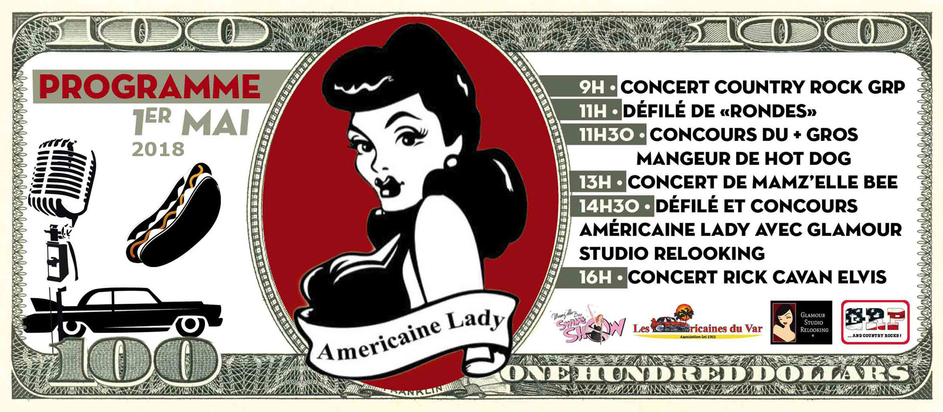 Américaine Lady 3 à La Seyne sur Mer, le 1er Mai 2018 - Journée Américaine 3 éditions avec cette année la matinée consacré à la country 1 concert et à partir de 13HOO Rockabilly. 2 Concerts , Défilé Relooking Rétro avec Glamour Studio Relooking , concours du plus gros mangeur de hot-dog (inscription à l'avance), stand commercial, buvette, food-truck, camps d'indien, taureau mécanique, circuit de voiture rétro, exposition de voiture sur inscription. Renseignement americainelady@hotmail.com
