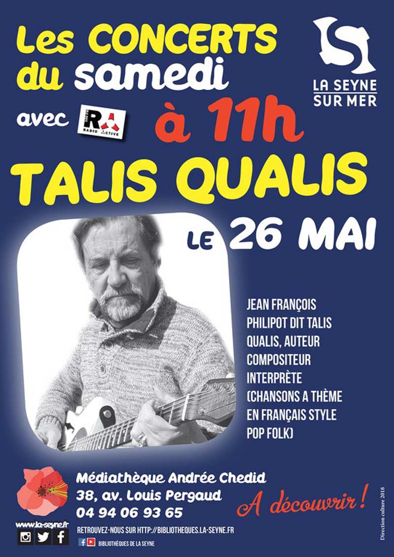 Auteur, compositeur, interprète, accompagné de sa guitare, Talis Qualis vous proposera des chansons à thème en français style pop folk. Renseignements au 04 94 06 93 65