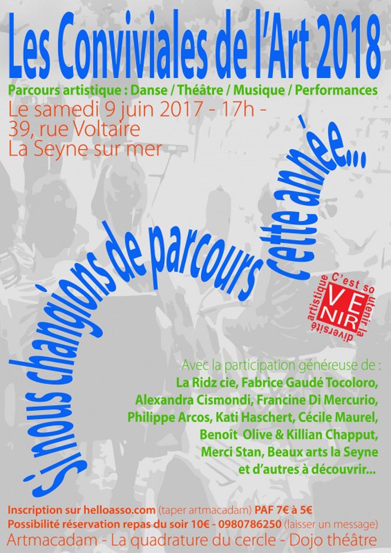 Parcours artistique: Les Conviviales de l'Art, le 09 Juin 2018 - Samedi 09 juin 2018 à partir de 17 heures, Artmacadam, la Quadrature du cercle et le Dojo théâtre organisent 39 rue Voltaire les Conviviales de l'Art, parcours artistique associant danse, théâtre, musique et performances.
