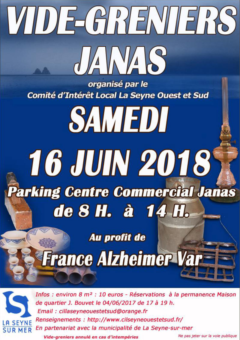 Vide Greniers Janas: le 16 Juin 2018 sur le Parking du Centre commercial - Le CIL La Seyne ouest et sud organise en partenariat avec la municipalité de La Seyne-sur-mer un Vide greniers au profit de France Alzheimer Var sur le Parking centre commercial de Janas - route de Janas - 83500 La Seyne-sur-Mer, le samedi 16 juin 2018 de 08h00 à 14h00.
