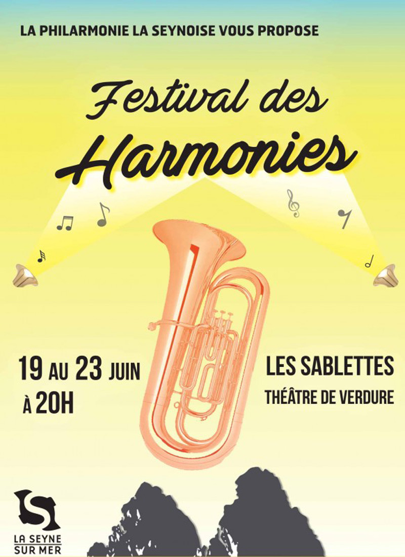 Le Festival des Harmonies, du 19 au 23 Juin 2018 aux Sablettes - Le festival des Harmonies est initié par la vénérable philharmonique La Seynoise. Quoi de plus normal que, du haut de ses 178 ans, elle invite ses consœurs de Toulon, la Garde et le Pradet à venir se produire dans notre beau théâtre de verdure des Sablettes. Des concerts de grande variété et de grande qualité qui démontrent la vitalité de cet art éternel de la musique d’harmonie qui attire sans cesse de nouvelles générations.
