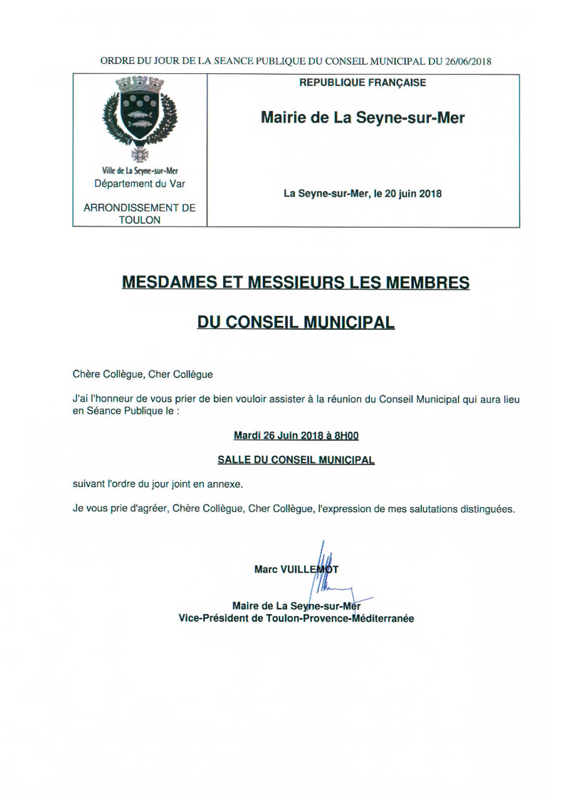 L'Ordre du Jour du Conseil municipal de La Seyne sur Mer du 26/06/2018 - Conseil municipal Mardi 26 juin 2018 à 8 heures Salle du conseil – Hôtel de ville ... Vous êtes conviés au conseil municipal, mardi 26 juin à 8 heures. Rendez-vous est fixé salle du conseil, au premier étage de l'hôtel de ville. Ci-joint l'ordre du jour.