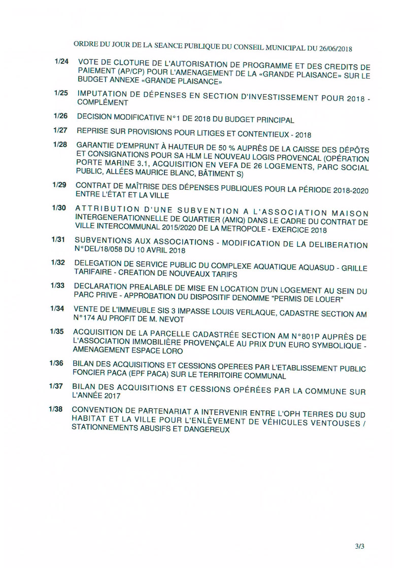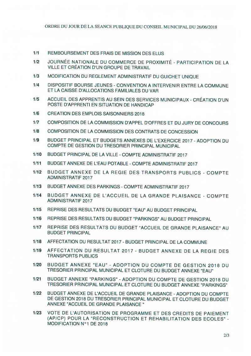 L'Ordre du Jour du Conseil municipal de La Seyne sur Mer du 26/06/2018