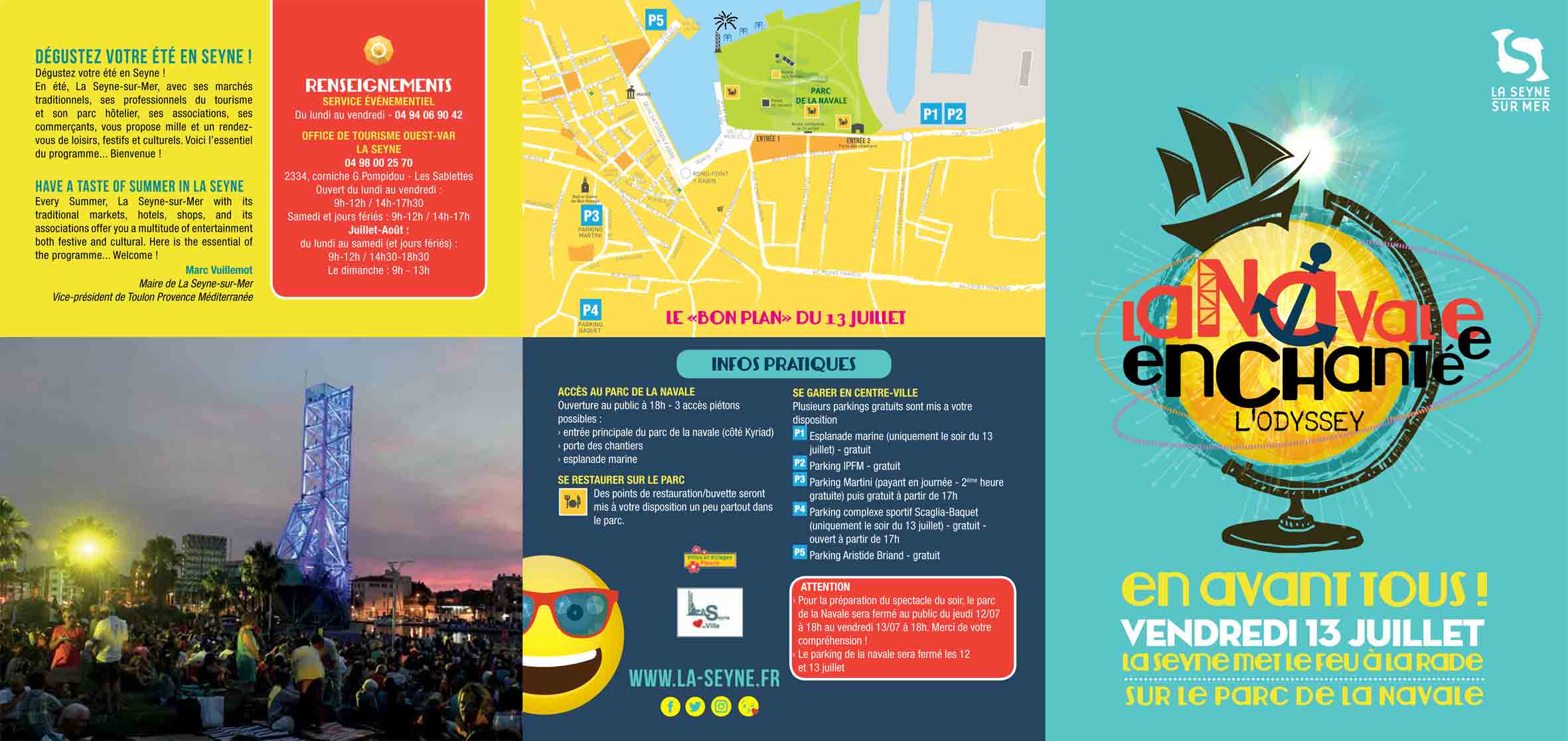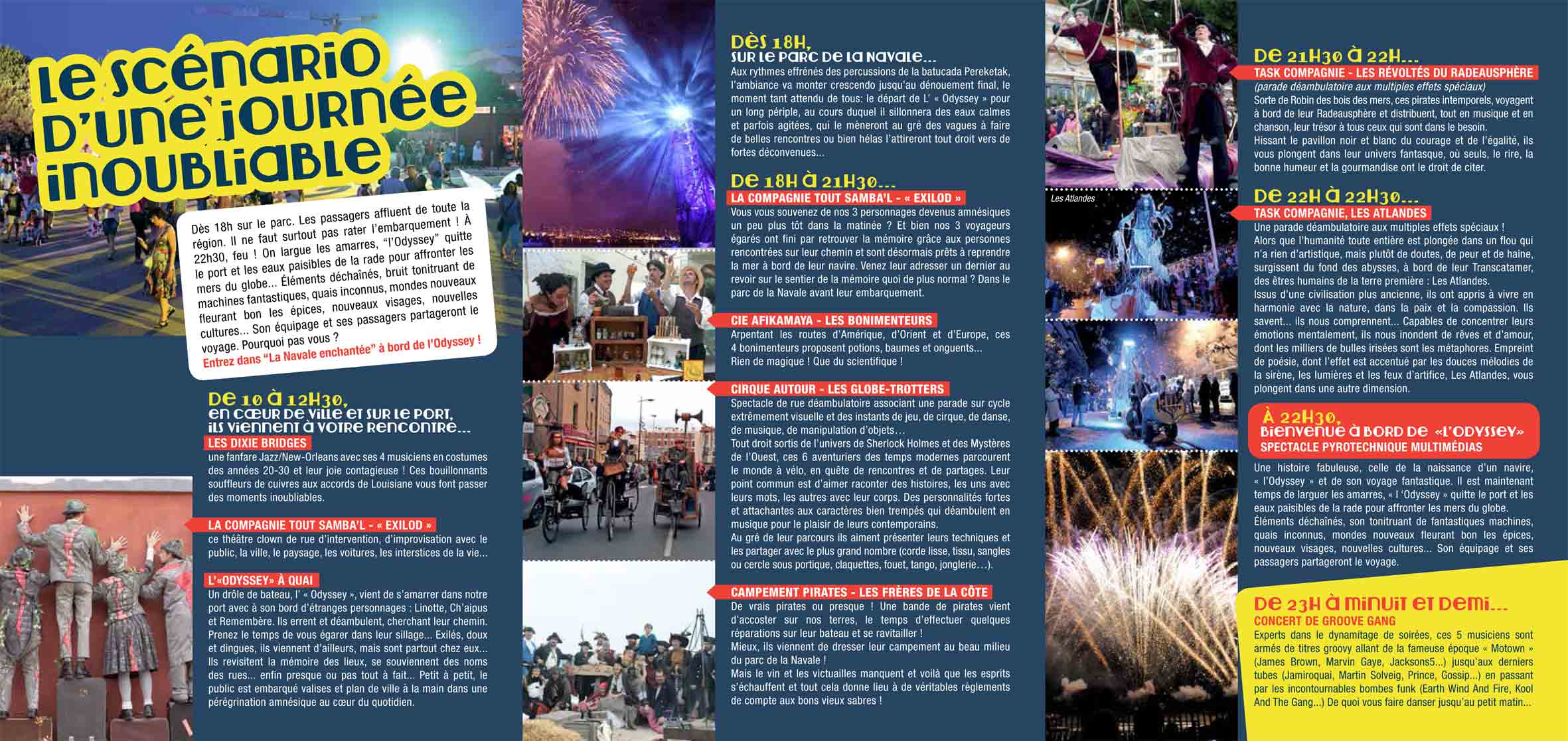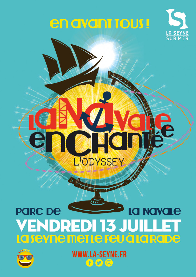 Le 13 juillet 2018, une histoire, tout fabuleuse nous sera contée. Celle de la naissance d’un navire, “l’Odyssey” et de son voyage fantastique. Scénario : dès 18h00, les passagers affluent de toute la région. Il ne faut pas rater l’embarquement. A 22h00, on largue les amarres, “l’Odyssey” quitte le port et les eaux paisibles de la rade pour affronter les mers du globe. Éléments déchaînés, son tonitruant de fantastiques machines, quais inconnus, mondes nouveaux fleurant bon les épices, nouveaux visages, nouvelles cultures … Son équipage et ses passagers partageront leur voyage. Pourquoi pas vous ? Rendez-vous à “La Navale enchantée”, le 13 juillet. A bord de l’Odyssey !.. Spectacle pyrotechnique à 22h30.
