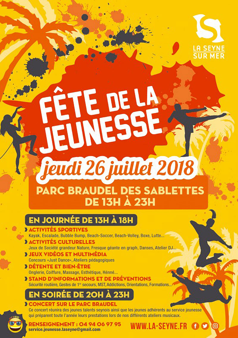 La Fête de la Jeunesse 2018, le 26 Juillet aux Sablettes - PARC BRAUDEL DES SABLETTES DE 13H00 À 23H00 ... EN JOURNÉE DE 13H00 À 18H00 - ACTIVITÉS SPORTIVES Kayak, Escalade, Bubble Bu, Beach-Soccer, Beach-Volley, Boxe. Lutte ...)