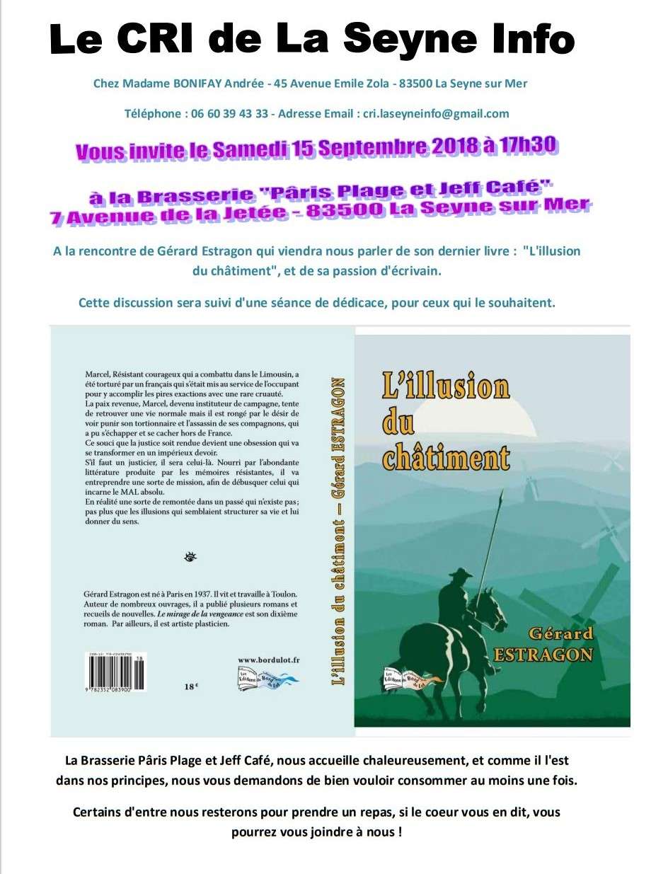 Rencontre avec Gérard Estragon: "L'Illusion du Châtiment" - Samedi 15/09/2018, Gérard Estragon est venu à notre rencontre, afin de nous parler de ses oeuvres, et de dédicacer son dernier roman "L'illusion du Châtiment".
