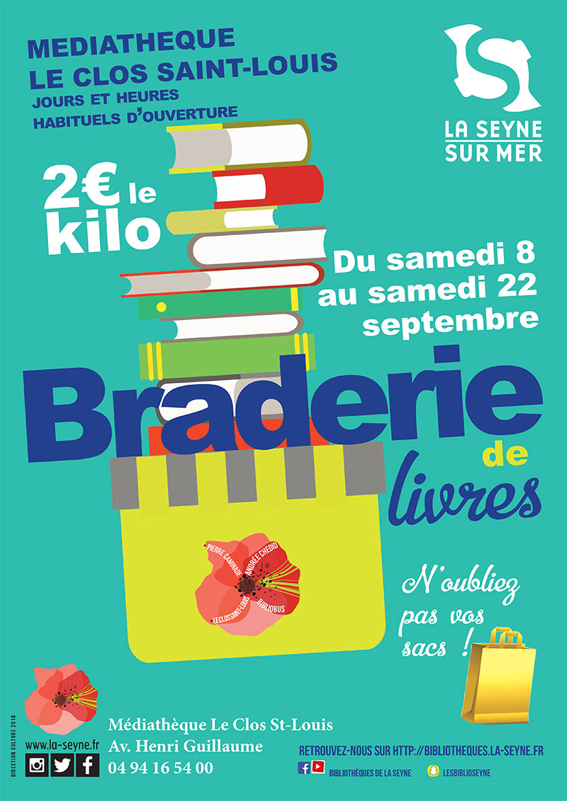 Braderie de Livres à la Médiathèque Le Clos Saint-Louis, du 08 au 22 Septembre 2018 - MEDIATHEQUE LE CLOS SAINT-LOUIS aux jours et heures habituels d’ouverture, 2€ le kilo de livres. Du samedi 08 au samedi 22 septembre 2018 à la Braderie de livres ... N’oubliez pas vos sacs !..