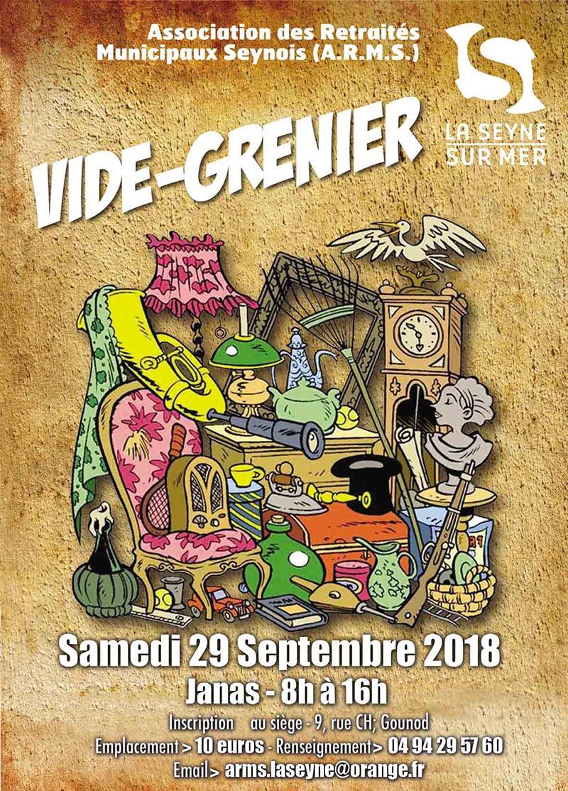 Vide-Grenier de l'"ARMS", le 29 Septembre 2018 à Janas - L'Association des retraités municipaux seynois (ARMS) organise un vide-grenier samedi 29 septembre de 08h00 à 16h00 au centre commercial de Janas. Dix €uros la place, les inscriptions se font les mercredi et vendredi de 09h00 à 11h00 au siège 09, rue Charles Gounod ... Renseignements au 04 94 29 57 60 ... Email: arms.laseyne@orange.fr