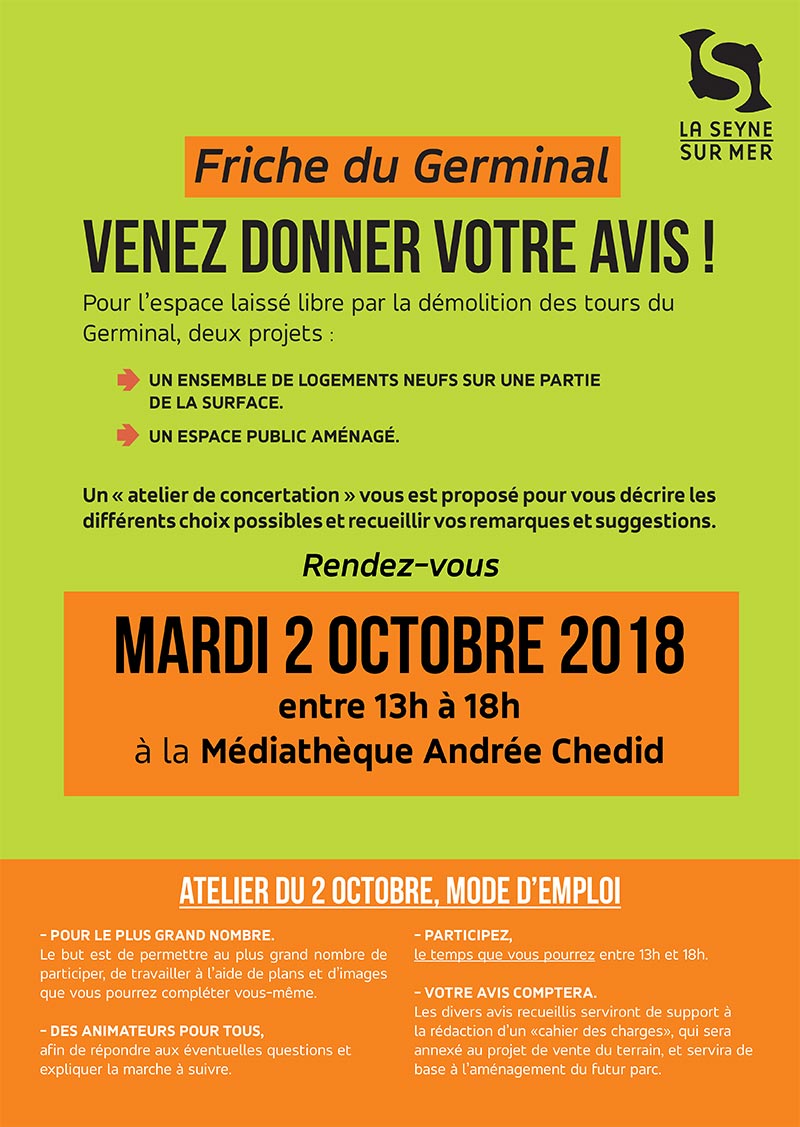 Atelier de Concertation sur la Friche du Germinal à Berthe, le 02 Octobre 2018 - Les Seynoises et les Seynois sont conviés à l'atelier de concertation sur l'aménagement de l'espace laissé libre par la démolition des tours du Germinal, mardi 2 octobre 2018 de 13h00 à 18h00, à la médiathèque Andrée Chedid, 38, avenue Louis Pergaud. VENEZ DONNER VOTRE AVIS ! Pour l’espace laissé libre par la démolition des tours du Germinal, deux projets :