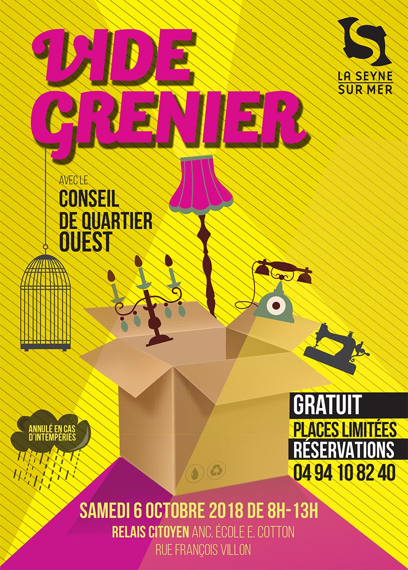 Vide-grenier du Relais Citoyen, le 06 Octobre 2018 ... Inscriptions - Dans le cadre de la commission « lien social », les conseillers de quartiers organisent un vide-grenier le samedi 06 octobre 2018 de 08 heures à 13 heures au Relais citoyen (ex école Eugénie Cotton). Les inscriptions, gratuites, se font par téléphone au service Vie des Quartiers au 04 94 10 82 40 tous les matins de 08h30 à 12h00.