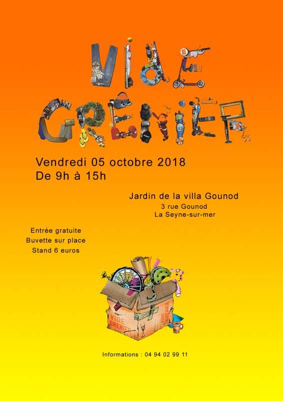 Vide-Greniers de l'Association cap d'Azur, le Vendredi 05/10/2018 - Ce vide-greniers a un but d'autofinancement des services de psychiatrie de La Seyne devant la baisse des subventions donnés à l'association ... Rendez-Vous de 09:00 à 15:00 au Jardin de la villa Gounod - 3 rue Gounod - 83500 La Seyne-sur-Mer - Contact: 04 94 02 99 11 - www.capdazur.e-monsite.com
